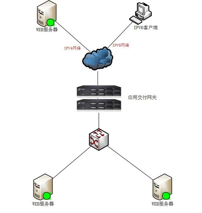 參見如下的網(wǎng)絡(luò)邏輯示意圖,應(yīng)?交付控制器作為 IPv6 和 IPv4 的協(xié)議網(wǎng)關(guān)來部署,同時(shí)提供數(shù)據(jù)中心 Web 應(yīng)用服務(wù)器集群的負(fù)載均衡等應(yīng)用交付的功能。數(shù)據(jù)中心內(nèi)部的應(yīng)用程序還沒有經(jīng)過 IPv6 的改造,依然是 IPv4 的環(huán)境,應(yīng)用交付控制器分別連接 IPv6 和 IPv4 兩個(gè)網(wǎng)絡(luò),通過虛擬服務(wù)器方式將數(shù)據(jù)中心的 Web 應(yīng)用發(fā)布在 IPv6 的網(wǎng)絡(luò)中(圖中以虛擬服務(wù)器vs_main: 2017:1::158:80 對 IPv6 的客戶端發(fā)布),IPv6 網(wǎng)絡(luò)中的客戶端可以訪問應(yīng)用交付網(wǎng)關(guān)發(fā)布的 IPv6 的虛擬服務(wù)器,通過代理的方式將請求轉(zhuǎn)發(fā)給數(shù)據(jù)中心內(nèi)部的真實(shí)服務(wù)器,得到響應(yīng)內(nèi)容之后將返回的內(nèi)容再轉(zhuǎn)換成 IPv6 數(shù)據(jù)包返給客戶端,從而保證客戶端能夠在?個(gè) IPv6 的網(wǎng)絡(luò)中訪問數(shù)據(jù)中心 IPv4 的應(yīng)用。