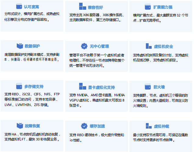 虛擬化場景融合計算和存儲資源,提供具有極簡 、高效 、可靠的虛擬化環(huán)境 。提供 OS 一鍵式交互安裝,支持業(yè)務(wù)的快速上線,靈活擴(kuò)展 。對各類資源統(tǒng)一管理,按需分配,支持一鍵巡檢 、歷史性能數(shù)據(jù)統(tǒng)一監(jiān)控 。支持第三方虛擬化管理平臺 、CDP 保護(hù)平臺 。支持?jǐn)?shù)據(jù)多副本及 EC 技術(shù) ,大幅提升用戶可得容量 。提供多種安全可靠策略 ,HA 高可用 、備份計劃,虛擬機(jī)保護(hù),保障業(yè)務(wù)連續(xù) 。
